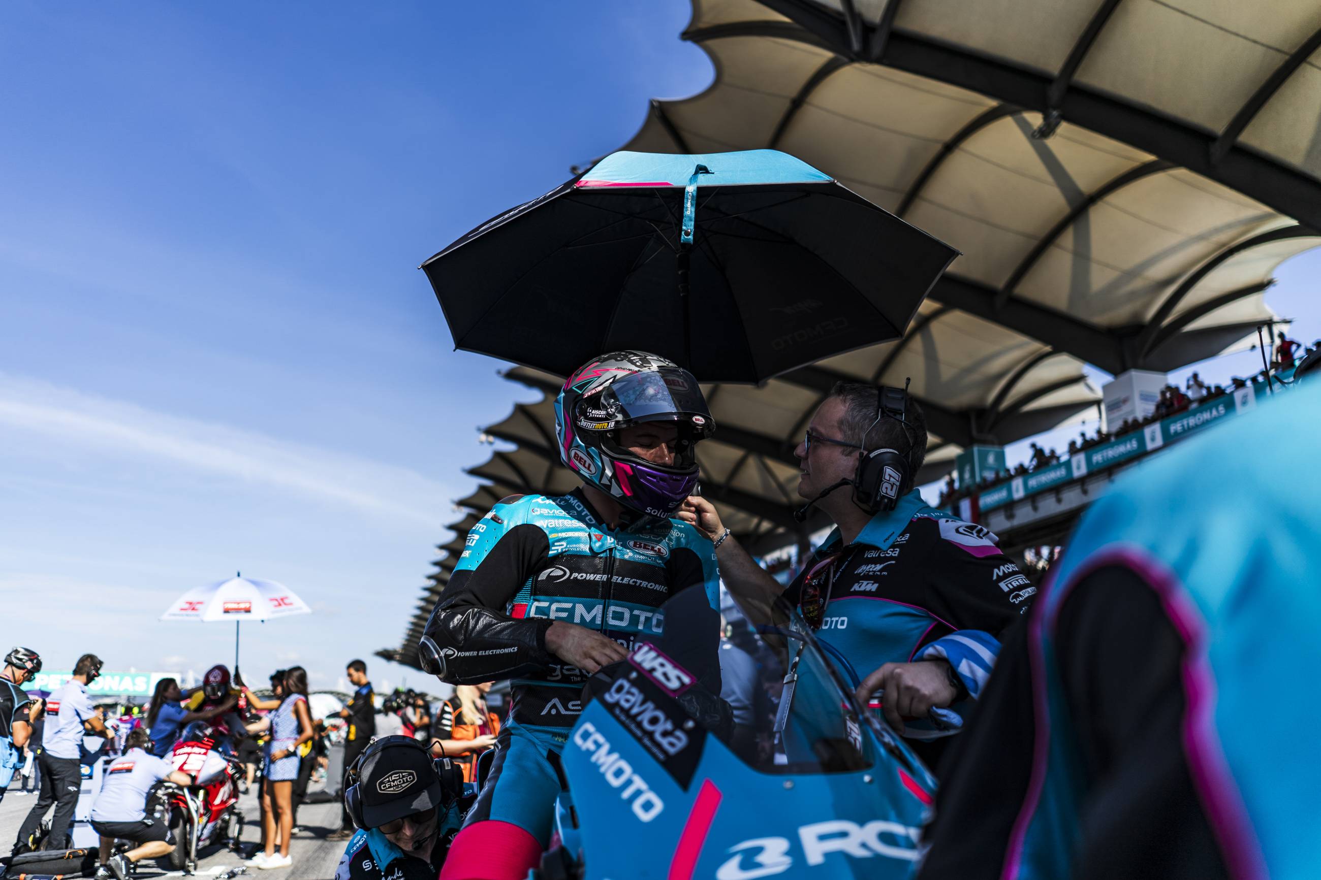 Due to an unexpected change in schedule, the Moto2 race started after the MotoGP category. As a result, the riders in the intermediate category faced even higher temperatures than expected, which made tyre grip difficult and left no room for error. Sunday's race was finally contested over eleven laps, after a crash forced the race to be stopped on the first lap, with no consequences for the rider involved. Dani Holgado started from pole after securing his third pole of the season in Malaysia. The CFMOTO RCB Aspar Team rider remained in second and tried to keep up with the leader. The Spaniard worked hard to maintain his position and avoid any mistakes that would cause him to lose more places. With four laps to go, he was overtaken by his teammate and fought for the podium, eventually falling to fourth place and crossing the finish line one tenth second behind third place. His teammate David Alonso has gone from strength to strength and is showing great maturity in his first year in Moto2. The Colombian made a good start and remained in the top three from the moment the lights went out. The CFMOTO RCB Aspar Team rider managed his tyres and rode at the limit, waiting for the right moment to overtake his teammate and finish in second place, securing his fourth podium of the year, his second in a row.