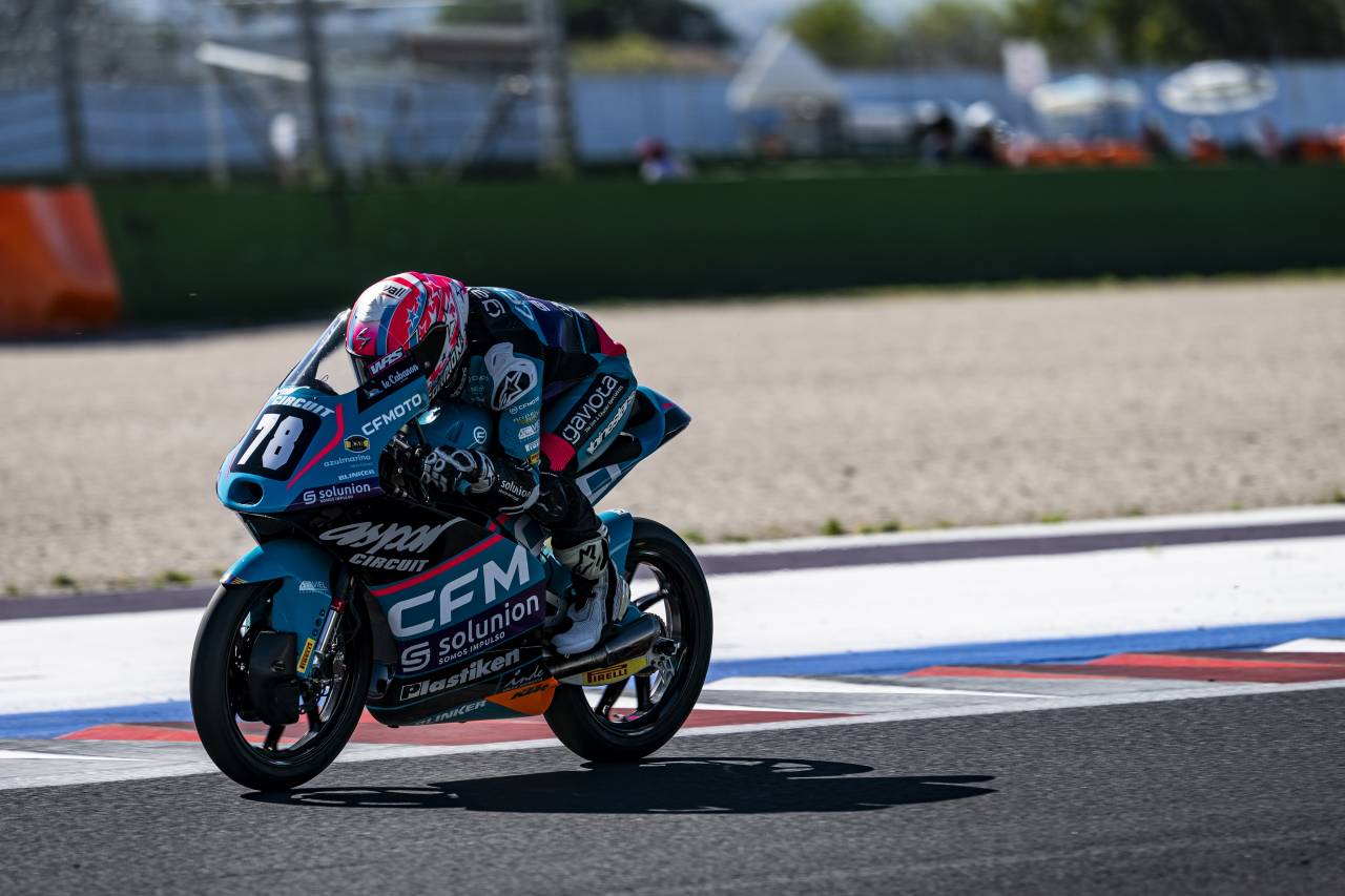 Álvaro Lucas ha afrontado el fin de semana en Misano dispuesto a recortar distancias en la clasificación general y ha vuelto a pelear por el podio en la primera carrera de la European Talent Cup. El piloto murciano, que salía desde la tercera fila de la parrilla, ha optado al podio hasta los últimos metros, cruzando la línea de meta en cuarto lugar y a tan solo 30 milésimas del tercer puesto. Desafortunadamente, una sanción por superar los límites de la pista le ha relegado a la séptima plaza. Lucas ha sufrido en la segunda prueba una caída que le aleja del líder de la categoría. Con estos resultados ha caído a la cuarta posición de la clasificación, con una diferencia de 35 puntos con el líder a falta de dos carreras para finalizar su primer año en la European Talent Cup. Su compañero Kerman Tínez no ha conseguido puntuar este fin de semana después de que tuviera que completar una “long lap” en una de ellas, y es decimonoveno en la general.