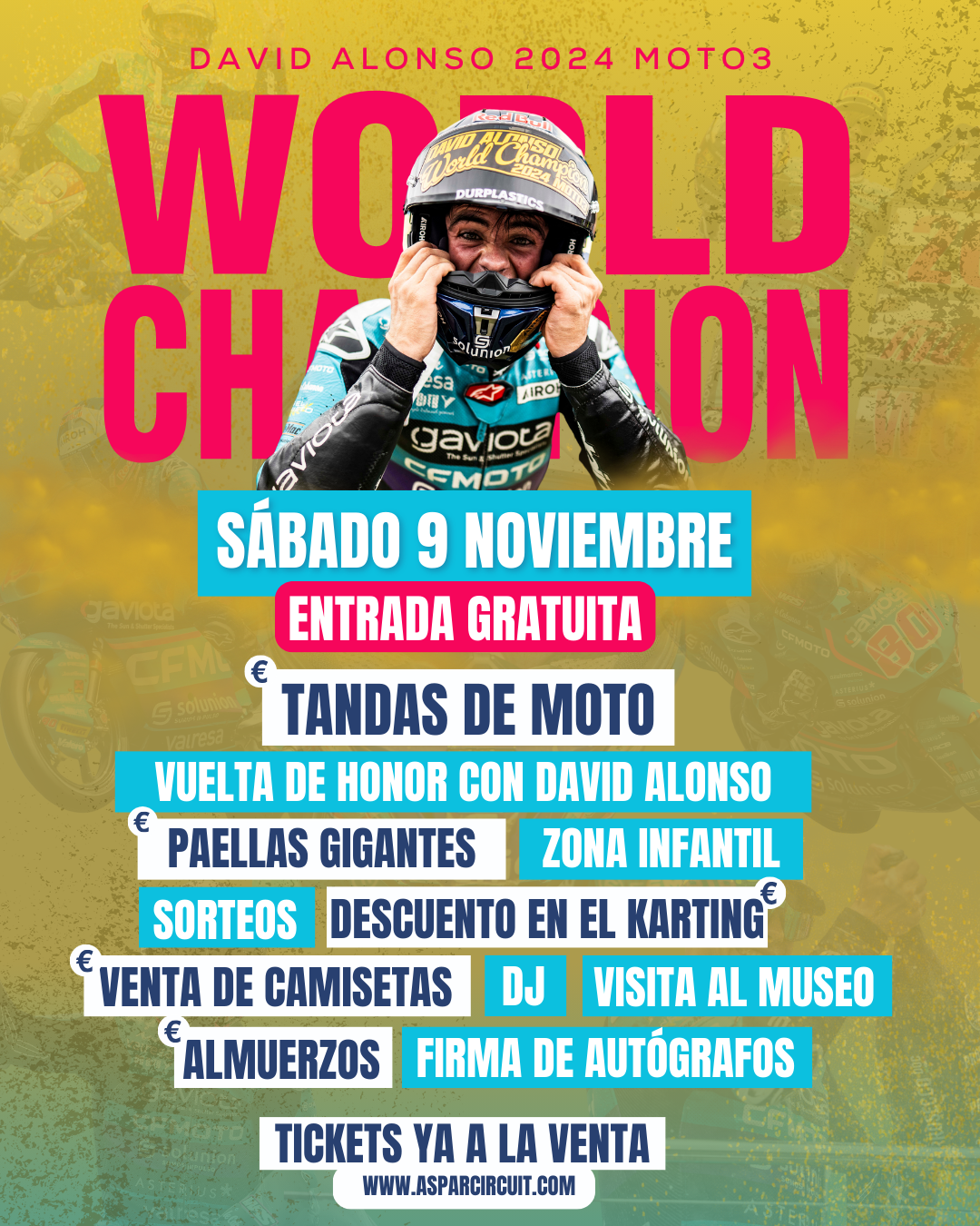 El próximo 9 de noviembre, el Aspar Circuit será el escenario de una gran celebración en honor al piloto del CFMOTO Aspar Team y campeón del mundo de Moto3, David Alonso. El colombiano se proclamó campeón hace unas semanas en el Gran Premio de Japón y ahora, antes de que llegue la traca final de la temporada con el Gran Premio de la Comunidad Valenciana, ha llegado la hora de celebrarlo.