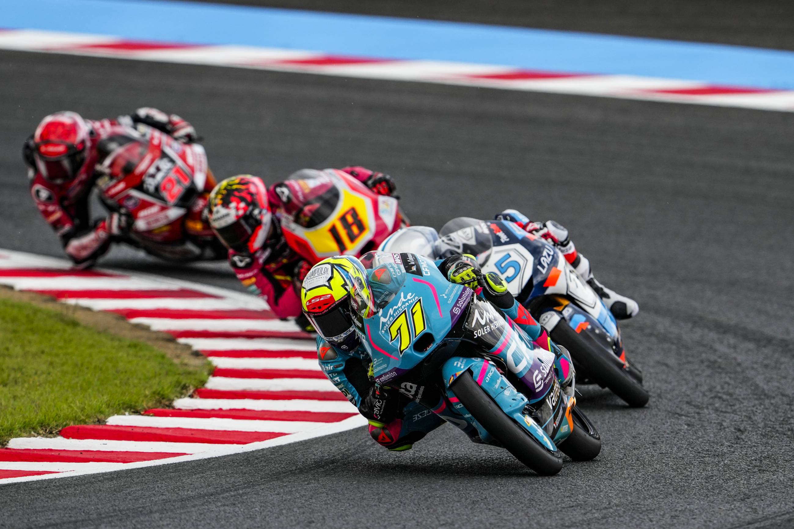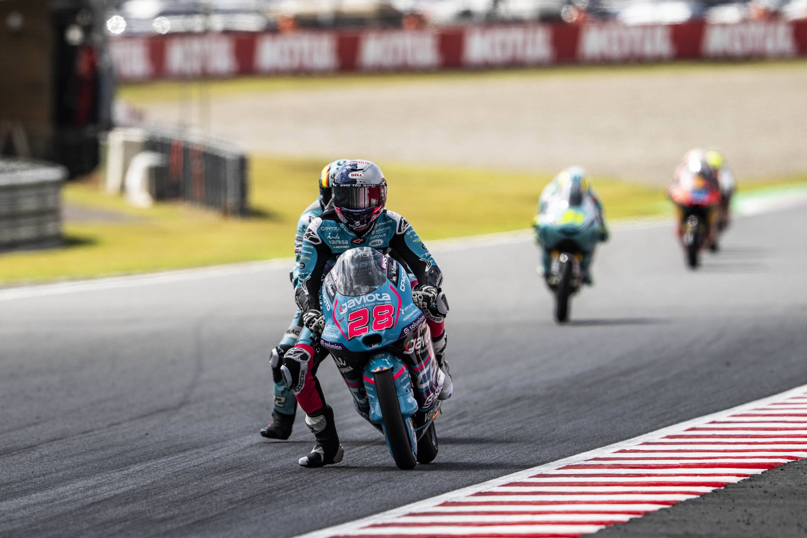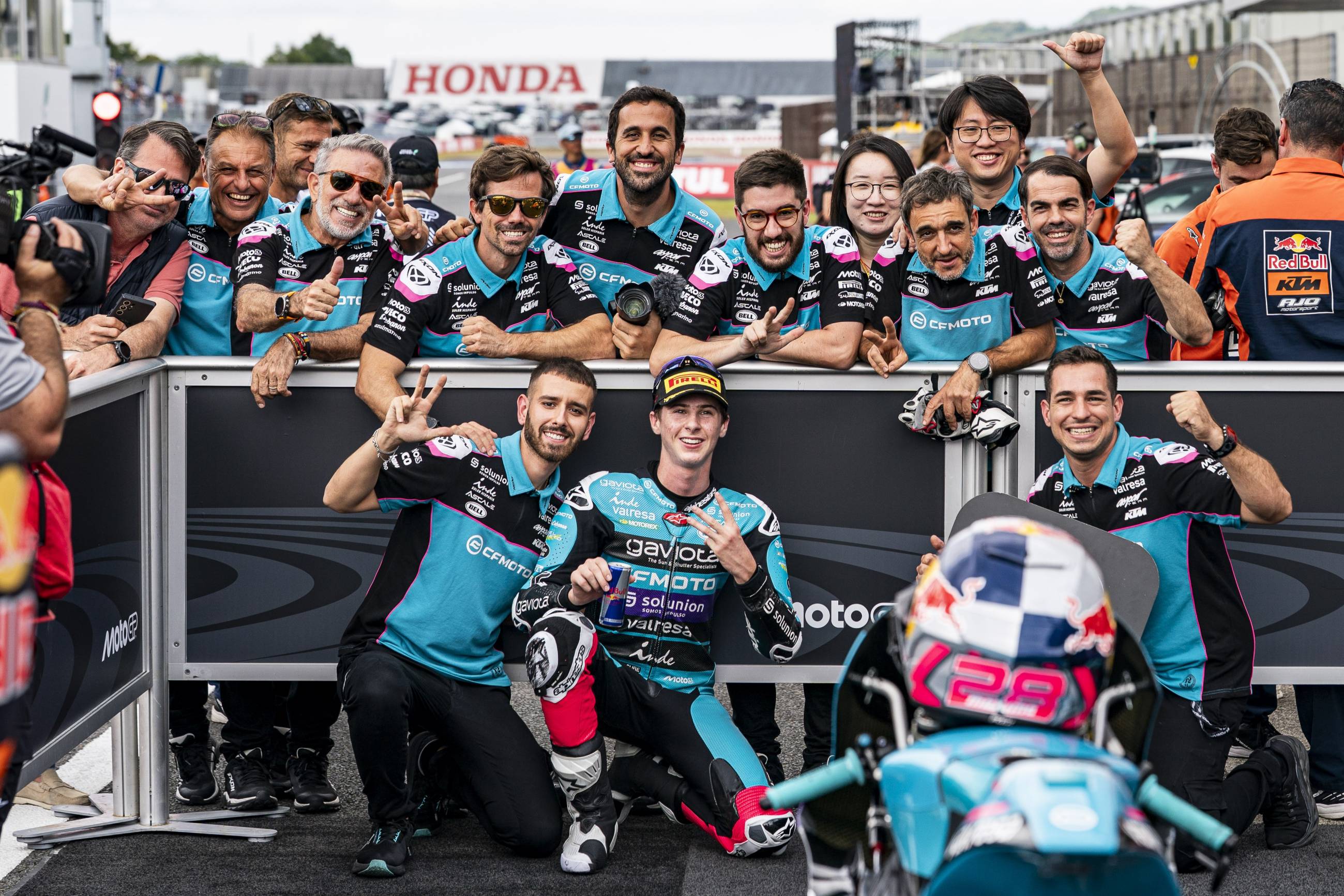Los pilotos del CFMOTO Gaviota Aspar Team han completado el Gran Premio de Japón con una exigente carrera. Máximo Quiles, que comenzaba la prueba desde la tercera fila de la parrilla, ha realizado una gran salida y tan solo ha necesitado cuatro vueltas para ponerse líder de la carrera. El español ha tratado de mantener la posición, pero la amenaza de lluvia y las primeras gotas caídas en el circuito de Motegi le han obligado a no tomar excesivos riesgos para mantenerse en el grupo delantero. Cumplida la primera mitad, Quiles ha recuperado las buenas sensaciones y ha vuelto a las posiciones de podio para encarar las últimas vueltas y pelear por un nuevo trofeo. En el último giro se ha visto envuelto en una intensa pelea y ha tenido que emplearse a fondo para mantenerse y poder cruzar la línea de meta en tercera posición. Por otro lado, su compañero Dennis Foggia se ha enfrentado a una carrera muy diferente después de tener que comenzar la carrera desde el final de la parrilla por una sanción. El italiano, que ha protagonizado un gran inicio de carrera, ha remontado hasta diez posiciones en las primeras vueltas y apenas ha necesitado cuatro vueltas para ocupar las posiciones de puntos. El piloto del CFMOTO Gaviota Aspar Team no se ha conformado y ha mantenido un ritmo alto para superar a sus rivales y ascender hasta la décima posición. Con estos resultados, Quiles ha podido recortar 11 puntos con el segundo clasificado y a falta de cinco carreras se encuentra a solo 18 puntos de Piqueras, mientras que Foggia se mantiene en la duodécima posición en la clasificación general.