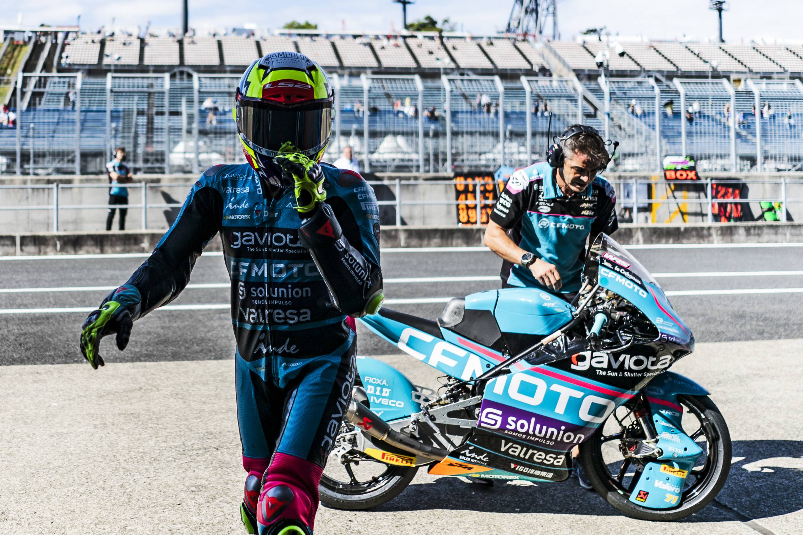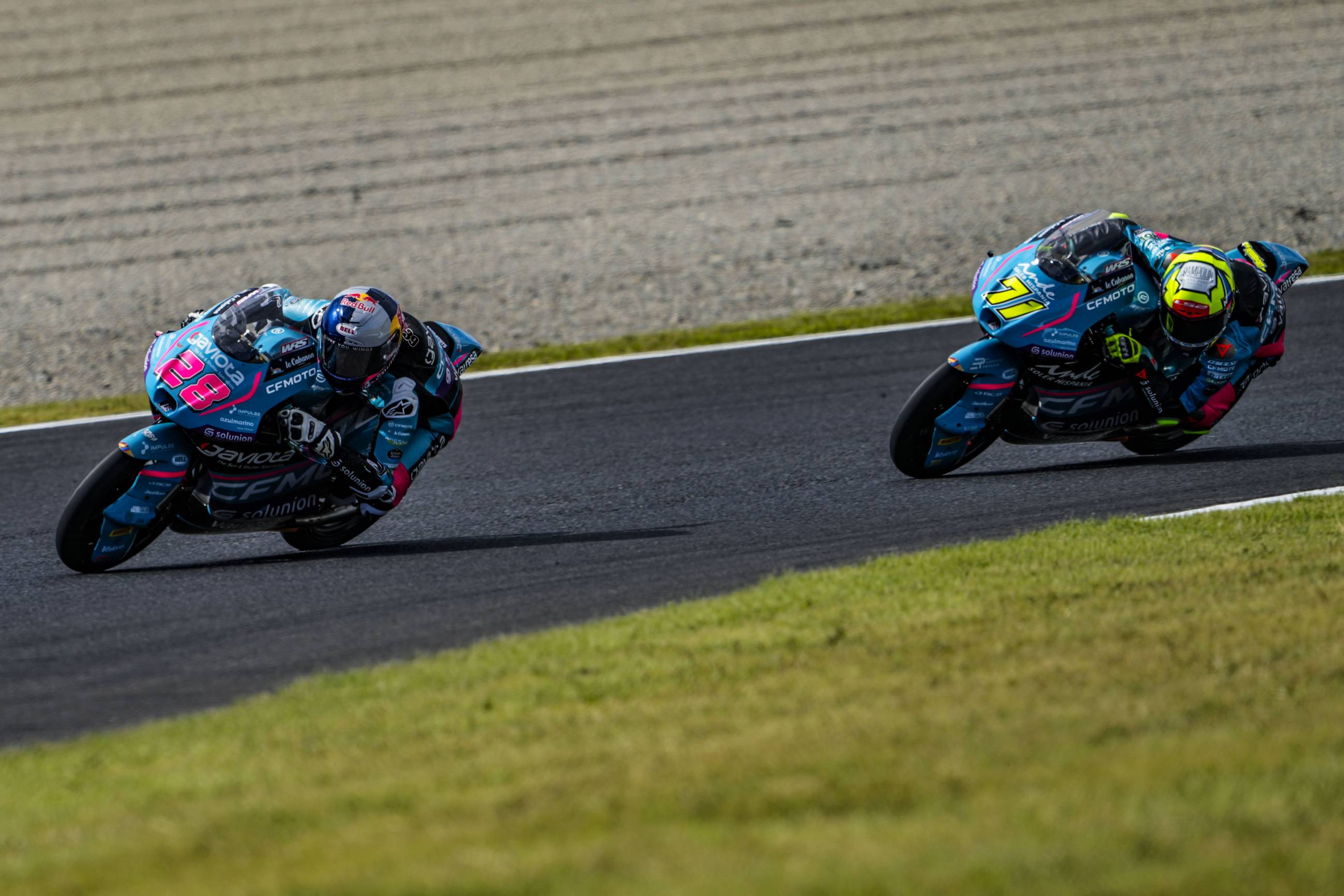 The CFMOTO Gaviota Aspar Team riders have secured direct entry into Q2 in Japan. Máximo Quiles and Dennis Foggia worked hard to achieve their goal and finished the day eight tenths off the fastest time, in thirteenth and fourteenth place respectively. On this occasion, David Muñoz set the pace in Moto3, followed by leader José Antonio Rueda in second and local rider Ryusei Yamanaka in third.