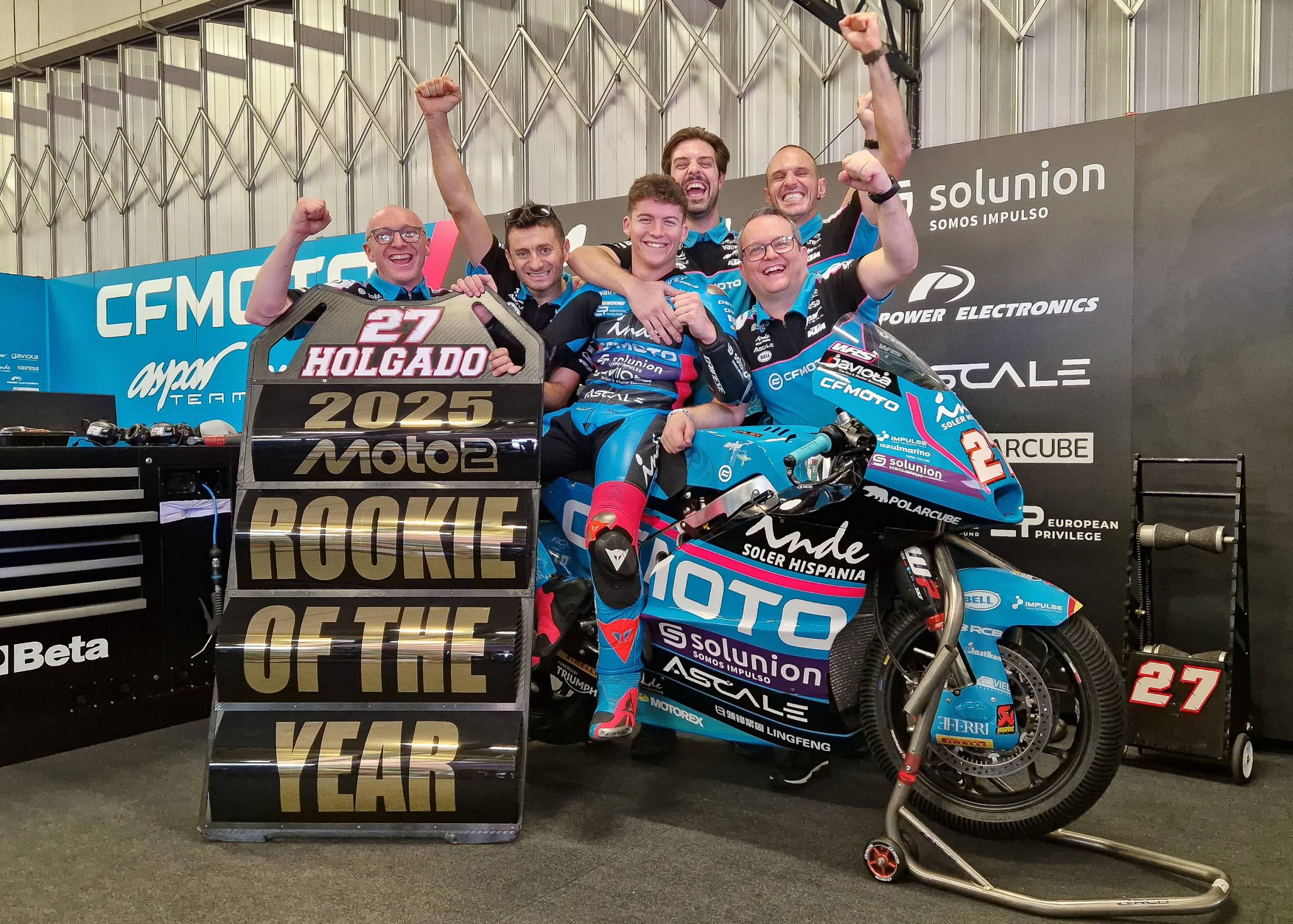 El piloto del CFMOTO Power Electronics Aspar Team Dani Holgado ha conseguido el título de debutante del año en Moto2 este fin de semana en Portugal, después de terminar séptimo en la carrera de hoy. Este título de mejor ‘rookie’ supone el tercero para un piloto del Aspar Team en la categoría intermedia, después de los que lograran Jordi Torres en 2013 y Aron Canet en 2020. De entre todos los debutantes del año en Moto2, sólo Marc Márquez, Maverick Viñales, Raúl Fernández o Pedro Acosta lograron durante su año más triunfos que el alicantino, que lleva dos victorias en 2025. Este logro, unido al título de debutante del año en Moto3 de Máximo Quiles, confirma el trabajo del Aspar Team y su programa de formación de jóvenes pilotos.